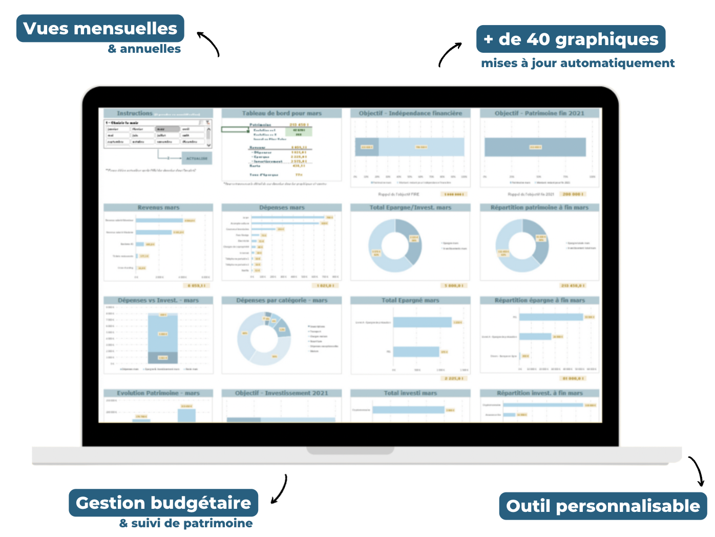 Suivez et optimisez vos dépenses / investissements grâce à une interface simple et des visuels (+ de 35) impactants mis à jour automatiquement